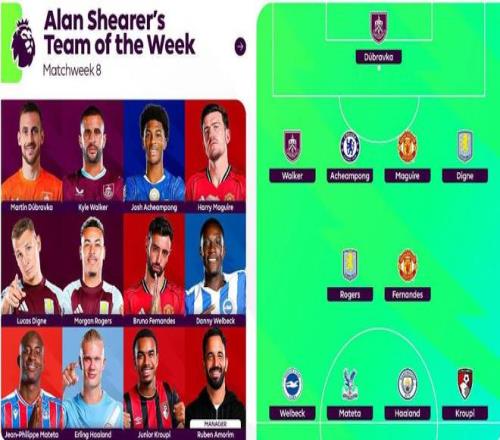 北京时间10月21日,英超官方晒出了阿兰-希勒评选的英超第8轮最佳阵容,其中哈兰德、B费、马奎尔、阿昌庞在列,教练是阿莫林。