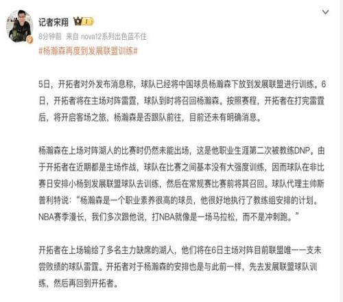 在这一场比赛到来之前,可能球迷最关注的还是杨瀚森到时候会不会有上场的时间。目前根据开拓者球队官方透露的消息,杨瀚森已经在湖人队的比赛结束之后,再度被下放到发展联盟这边参加训练。在对阵雷霆的比赛时再度召回来,不过这样的操作反反复复,实际上也让中国球迷产生了一些质疑和争论,杨瀚森是不是成为了球队的卖票吉祥物?