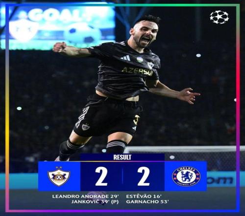 下半场7分钟加纳乔传球被挡后左脚推射扳平,最终,首发身价仅1232万欧的卡拉巴赫2-2逼平4.2亿欧的切尔西。这是卡拉巴赫欧战7次面对英超球队拿到的第一分。